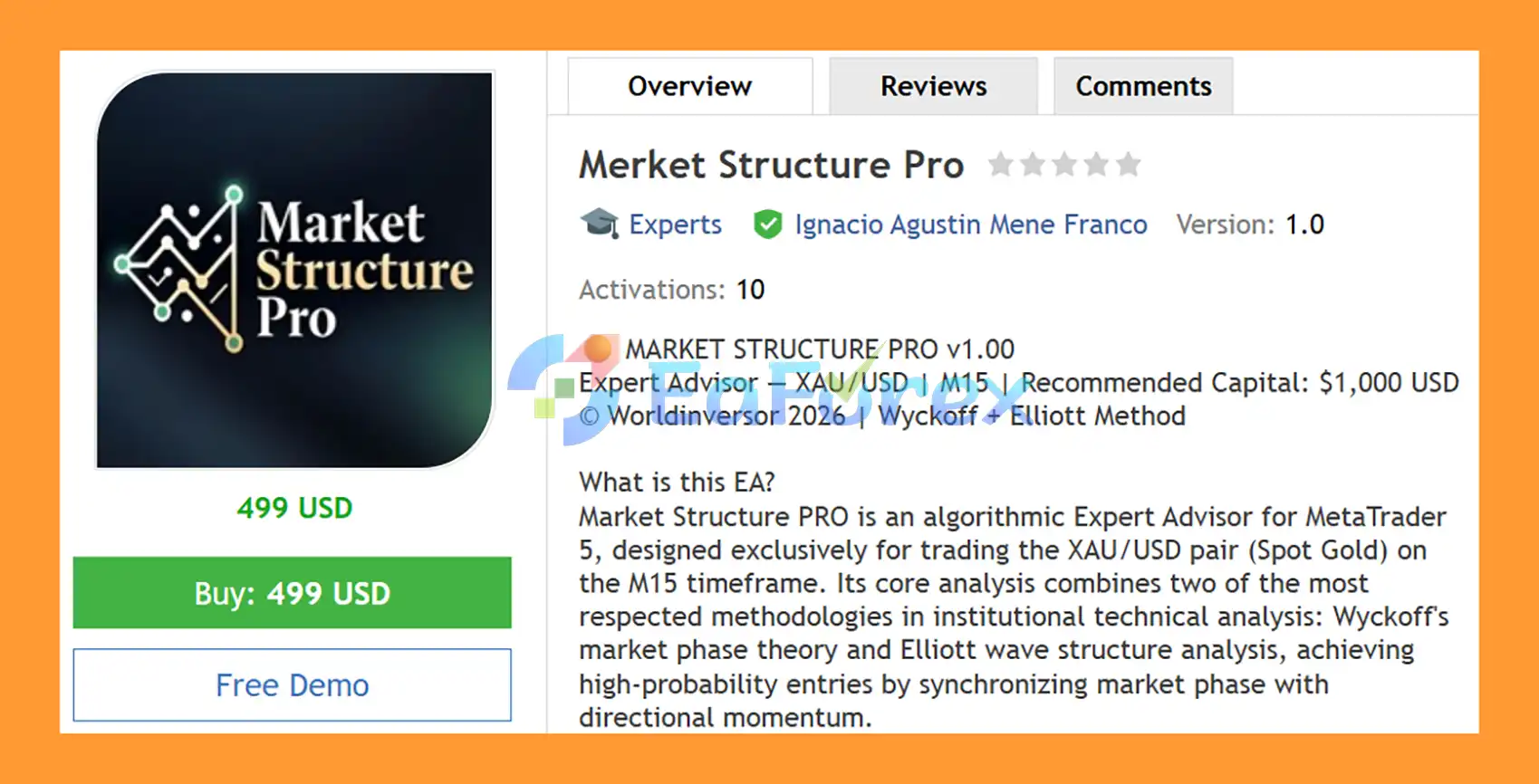 In summary, Merket Structure Pro EA MT5 is a sophisticated algorithmic trading system designed specifically for XAU/USD on the M15 timeframe, combining institutional-grade Wyckoff market phase theory with Elliott Wave analysis to deliver highly structured and disciplined trading decisions. The EA emphasizes confluence-based execution, only entering the market when both market structure and momentum direction align, helping to filter out low-quality and uncertain setups. With advanced features such as volume-structure analysis, wave classification, market regime filtering, pending order execution, and comprehensive risk management tools, the system is built to operate with precision in volatile gold market conditions. Its additional protections, including spread filters, break-even logic, and trailing stop mechanisms,