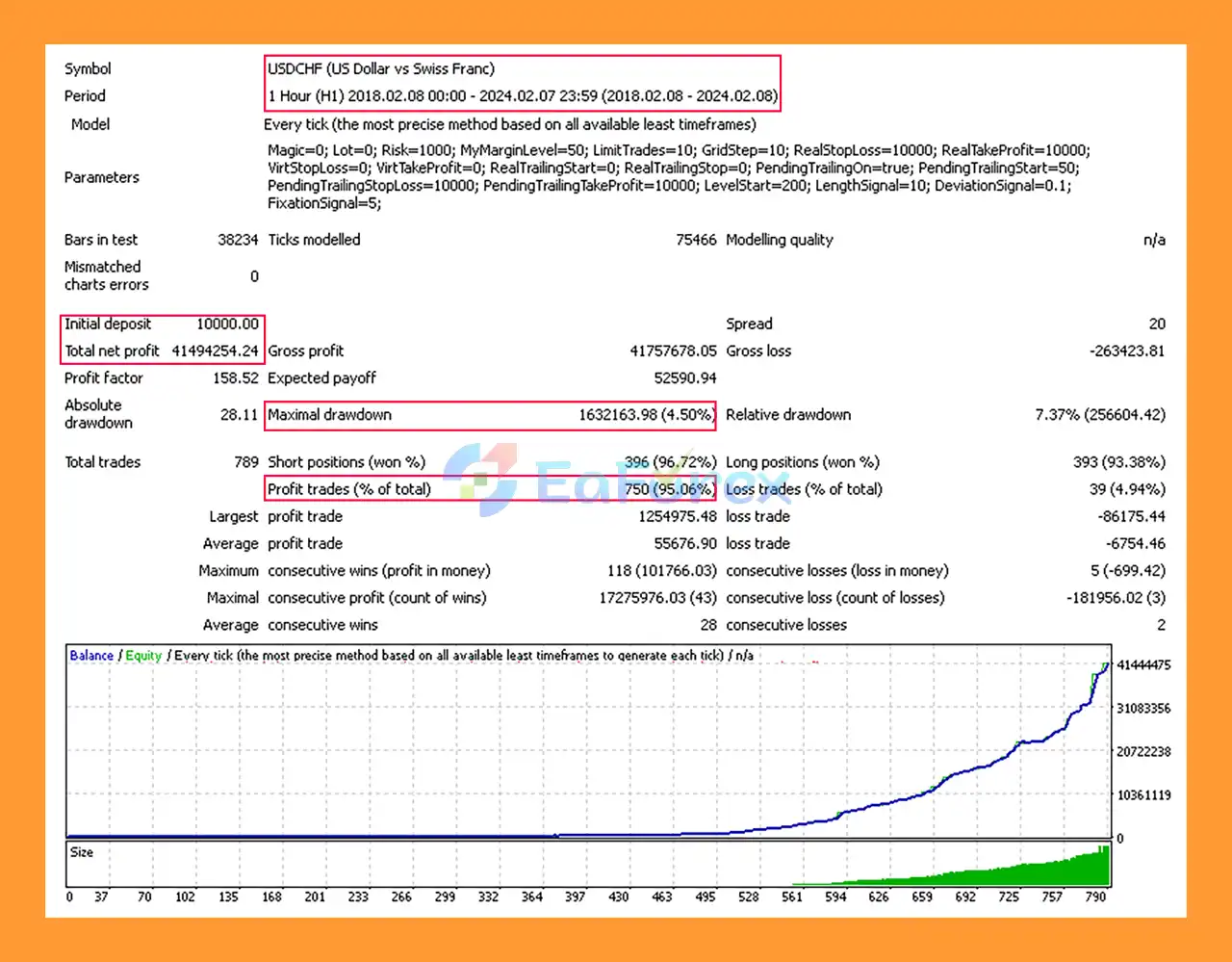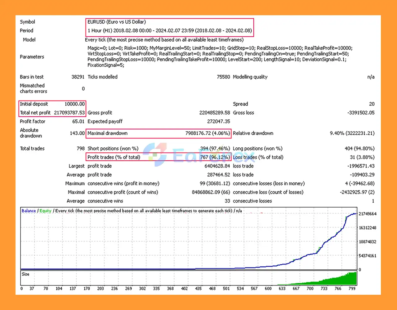 EUR/USD (6 years) → $217.093M profit, 96.12% win rate, 4.06% drawdown