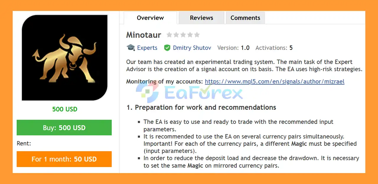 In summary, Minotaur EA MT4 is an experimental, high-risk automated trading Expert Advisor designed primarily for signal account building and aggressive equity growth. It relies on a martingale-based order management system, combined with grid trading and basket-level profit closure, to scale positions dynamically across multiple currency pairs. With features like magic number control, fix-profit recovery, mirrored pair logic, and multi-pair support, Minotaur EA is best suited for experienced traders and signal providers who understand martingale risk and seek high-growth potential in ranging or correlated market conditions, rather than conservative or prop-firm–style trading.