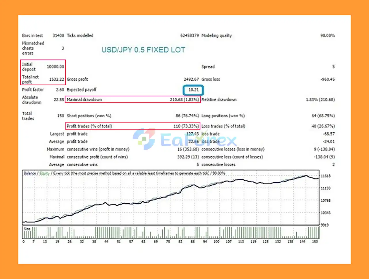 The EA can run on standard Forex accounts, with backtests using $10,000 initial deposits, though dynamic lot sizing allows adaptation to smaller accounts while controlling risk.