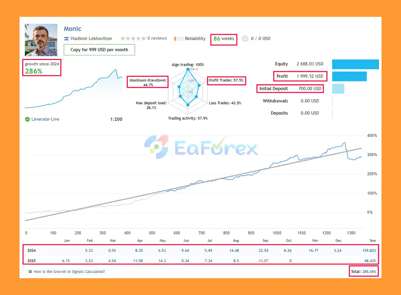 • Live trading over 86 weeks shows 286% growth since 2024.