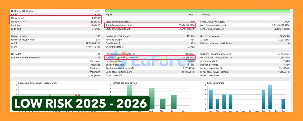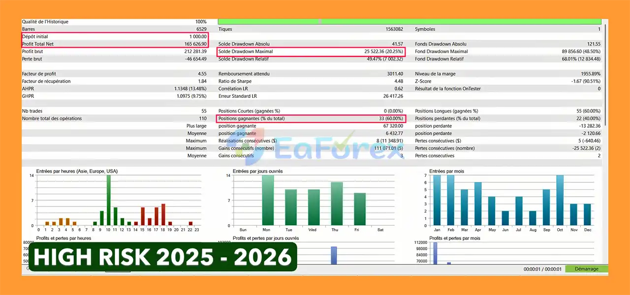 Backtests show strong performance, with high profits and controlled drawdowns in both high-risk and low-risk configurations. However, live results may vary depending on broker conditions and market volatility.