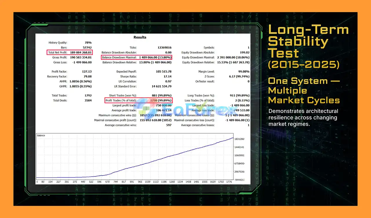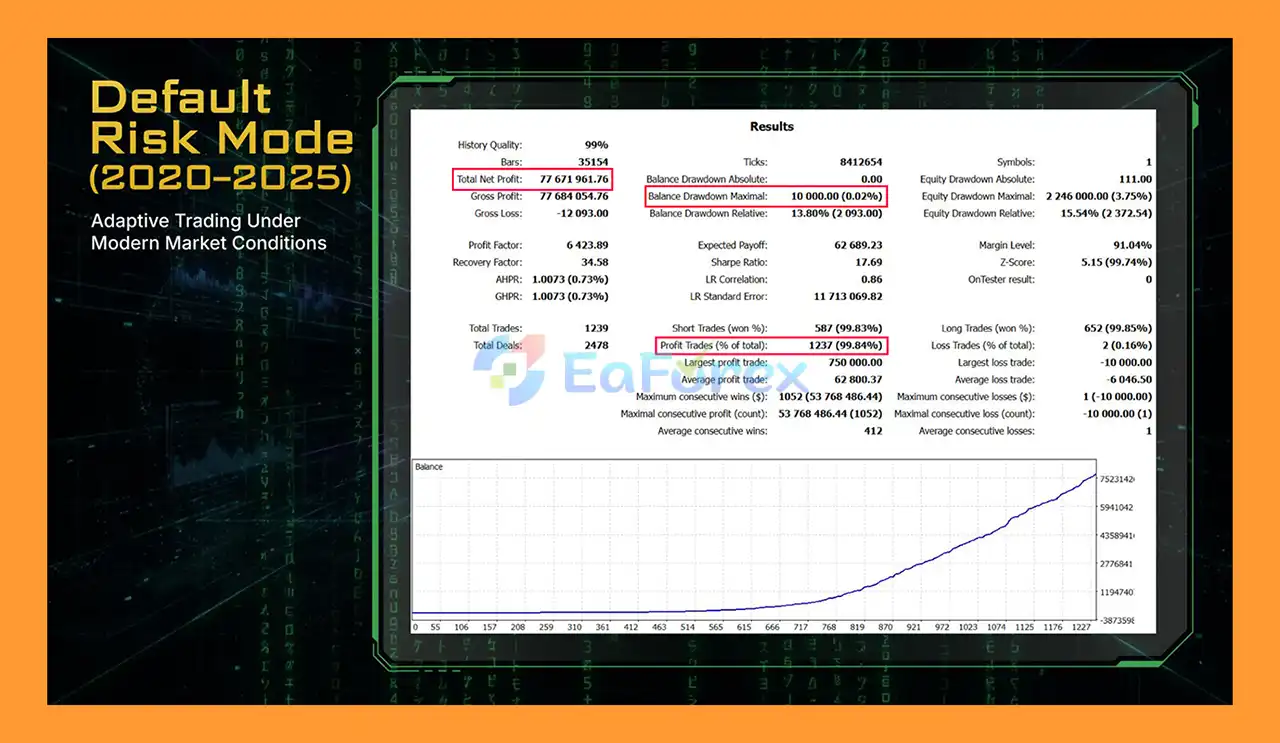 The EA uses an Adaptive Risk Compression Engine, dynamically adjusting position size based on market stability. It automatically reduces or pauses exposure during abnormal volatility and prevents over-leveraging with internal exposure limits.