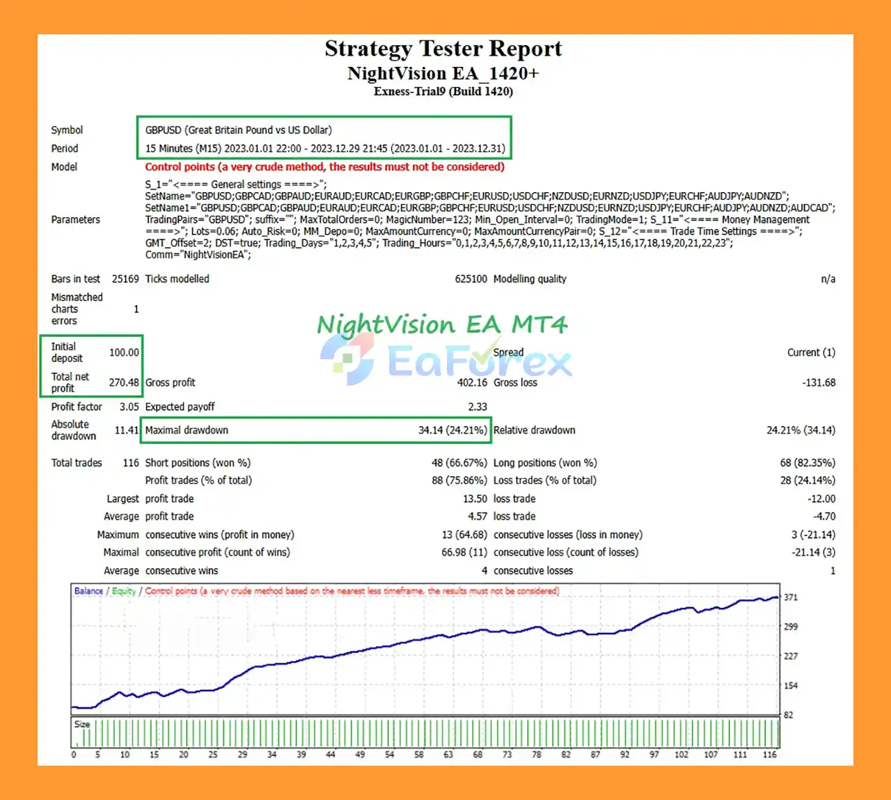 NightVision EA MT4 is a night trading EA for major currency pairs with Stop Loss and Take Profit protection, providing stable and low-risk profits overnight.