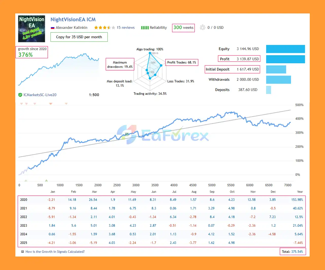 According to Myfxbook-verified results, NightVision EA achieved +377% total gain over 300 weeks with an average monthly growth of 2.23% and a maximum drawdown of only 19.4%, confirming its real-world stability.