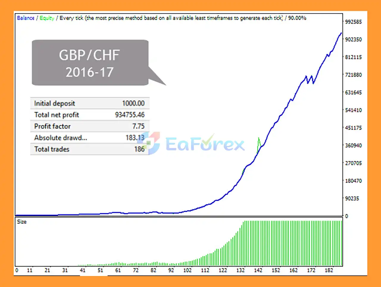 Backtest results show significant performance across multiple pairs. For example, starting with $1,000, results reached over $675,000 on EUR/AUD and over $1.13 million on EUR/CHF within 12 months, depending on settings and conditions.