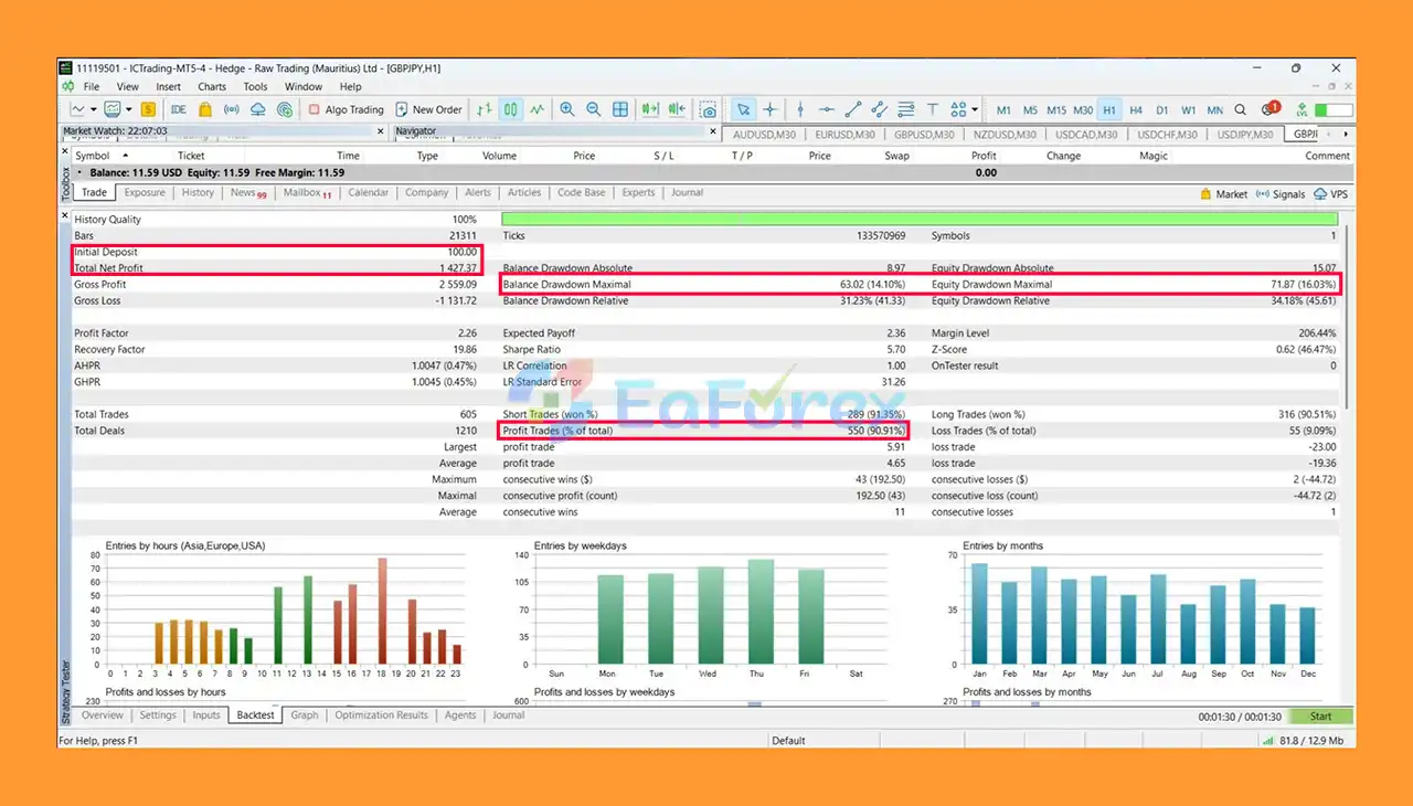 Backtests on GBPJPY show strong performance: starting from $100, it achieved +1400% profit growth, a 90.91% win rate, and only 14.10% maximum drawdown, proving a balanced risk-to-reward approach.