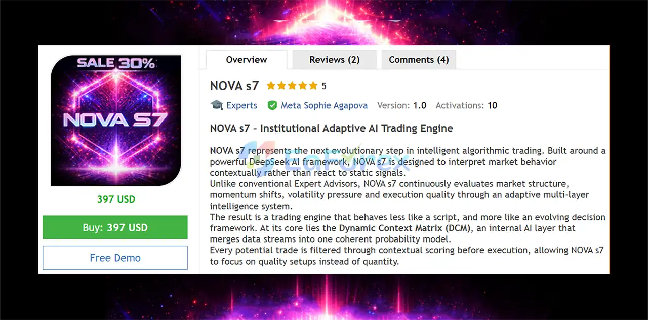 In summary, NOVA s7 EA MT5 is a next-generation AI trading solution for MetaTrader 5, powered by DeepSeek technology and developed by Meta Sophie Agapova. Specifically optimized for XAUUSD (M15), it leverages a Dynamic Context Matrix (DCM), Adaptive Volatility Synchronization (AVS), and Neural Trade Refinement Memory (NTRM) to deliver context-aware, high-probability trade execution. With verified MyFxBook results showing strong profitability, controlled drawdown, and consistent monthly growth, NOVA s7 EA MT5 stands out as a professional, institutional-grade Expert Advisor focused on long-term stability rather than aggressive overtrading. For traders seeking an adaptive, self-learning gold trading EA with precision-based logic and AI-driven market interpretation, NOVA s7 EA MT5 represents a powerful and future-ready automated trading system.