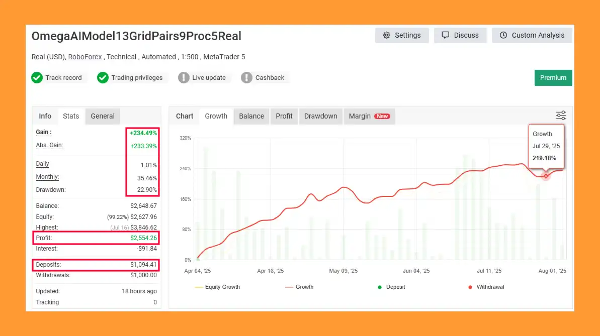 Verified by Myfxbook, OmegaAI EA MT5 shows +234.49% total gain, ~1% daily growth, ~35% monthly growth, and a 22.90% drawdown. Backtests from $1,000 deposits achieved $2.65M net profit with controlled risk.