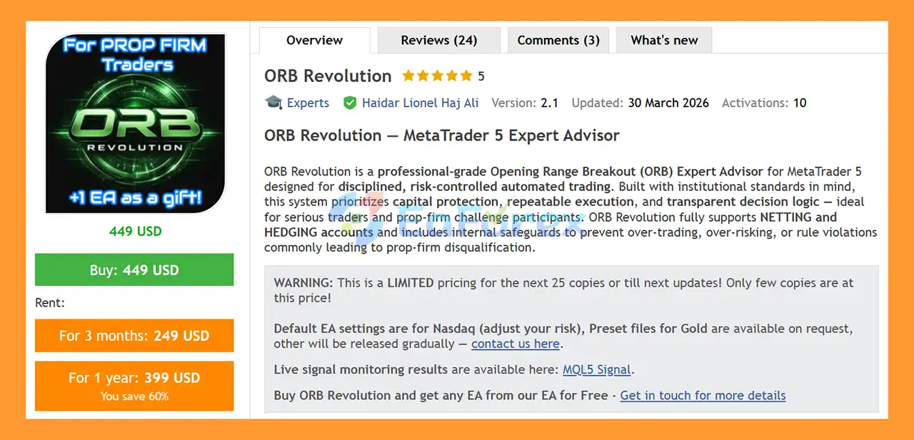 • Notable Products: ORB Revolution EA MT5  and other advisors.