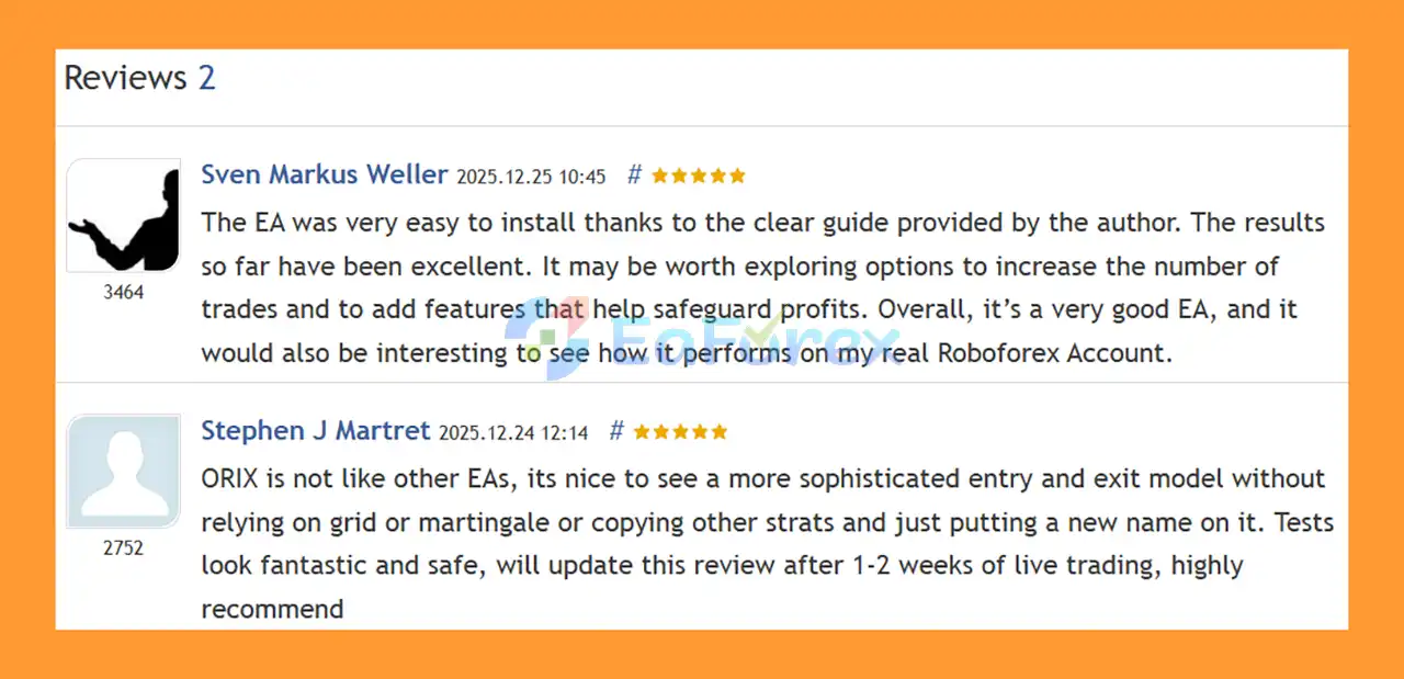 🔺ORIX mt5  is highly appreciated by the MQL5 community for bringing stable and reliable profits. Below are 5 star reviews from users: