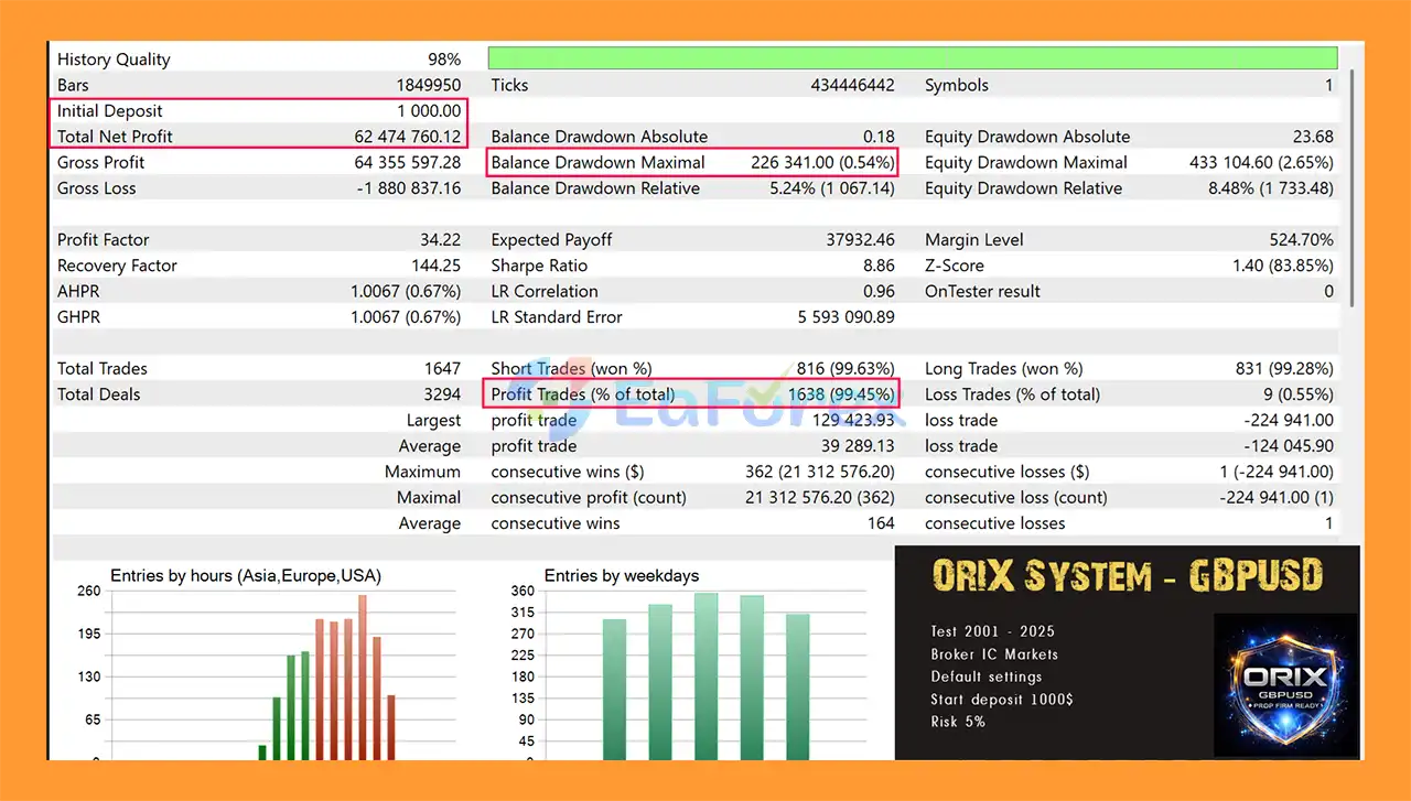 ORIX MT5 backtests show strong historical performance on GBPUSD over long periods, with high win rates and low drawdown. However, like all automated trading systems, past performance does not guarantee future results, and live market conditions may vary.