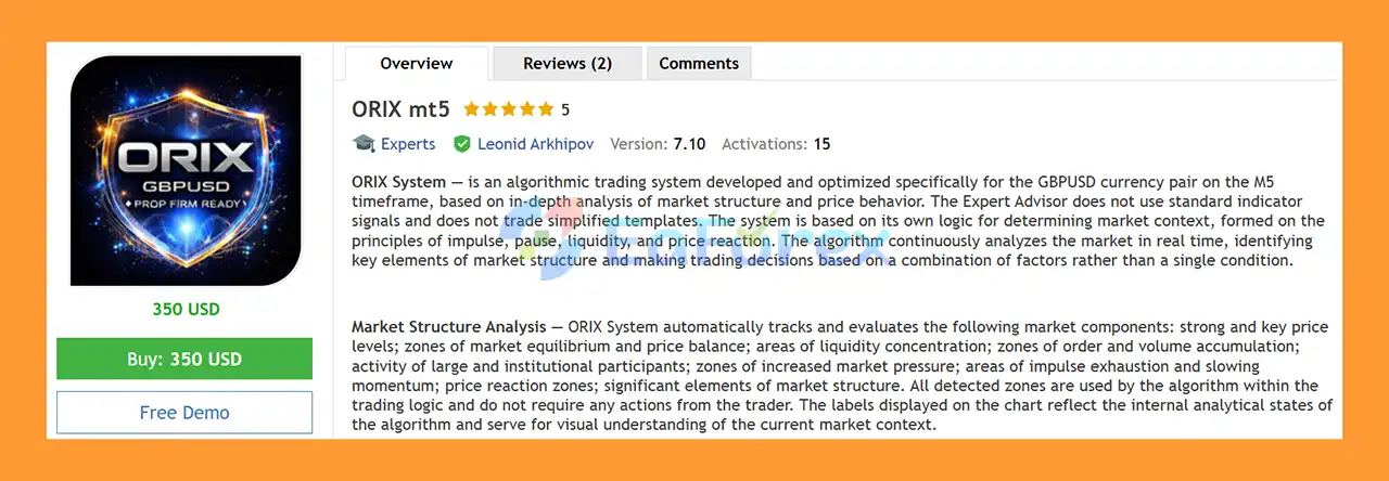 In summary, ORIX MT5 is a professional-grade, high-precision algorithmic trading system designed exclusively for GBPUSD on the M5 timeframe, focusing purely on market structure and real price behavior. By eliminating lagging indicators and aggressive strategies such as martingale or grid trading, ORIX MT5 delivers a disciplined, transparent, and risk-controlled trading approach. Its ability to analyze liquidity zones, impulses, equilibrium areas, and institutional activity in real time makes it especially suitable for traders who prioritize consistency, precision, and long-term stability.