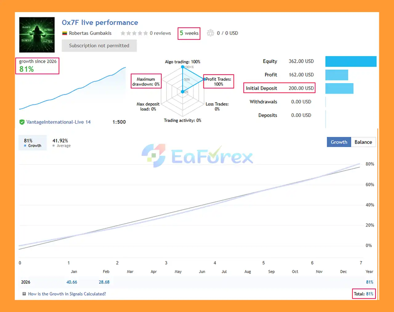 - Notable Products: Ox7F EA MT5, Ox7F EA MT4 and other advisors