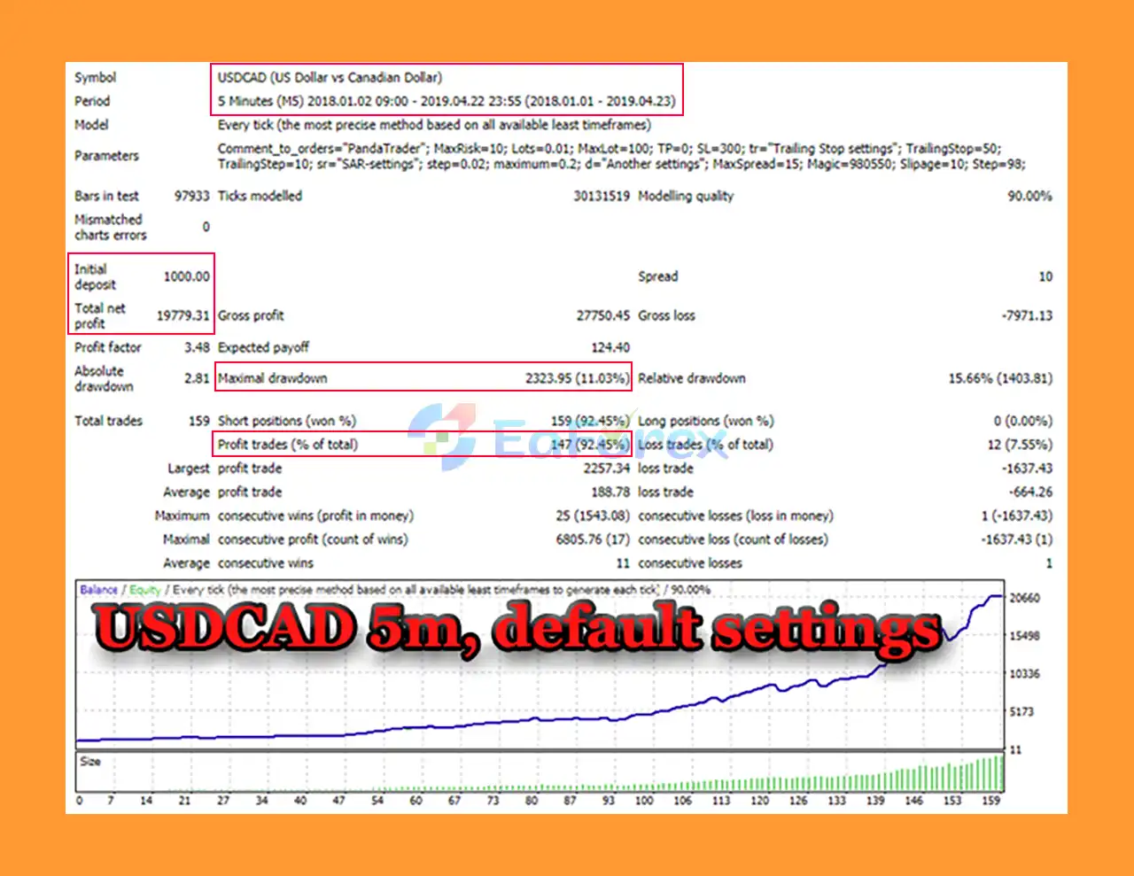 USDCAD (16 months): $1,000 → $19,779 net profit, 92.45% win rate, 11.03% maximum drawdown