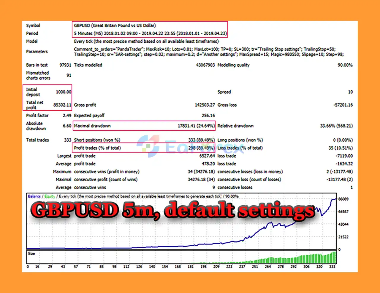 GBPUSD (16 months): $1,000 → $85,302 net profit, 89.49% win rate, 24.64% maximum drawdown