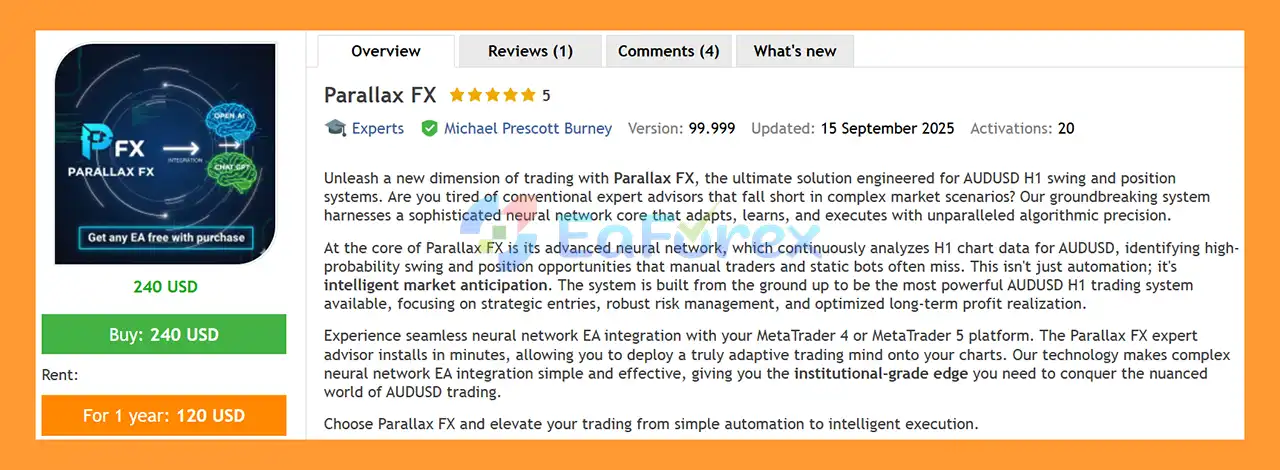 In summary, Parallax FX EA MT5 is a cutting-edge neural-network-powered Expert Advisor designed exclusively for AUDUSD H1 swing and position trading. By leveraging adaptive neural intelligence instead of static indicators, it continuously learns from evolving market behavior to identify high-probability trading opportunities with exceptional precision. Developed by Michael Prescott Burney, the EA combines predictive market analysis, institutional-grade logic, and robust risk management to deliver long-term performance with minimal drawdown. Backed by strong backtest results and a fully automated, user-friendly setup, Parallax FX EA MT5 is an excellent choice for traders seeking intelligent, future-ready automation on MetaTrader 5.