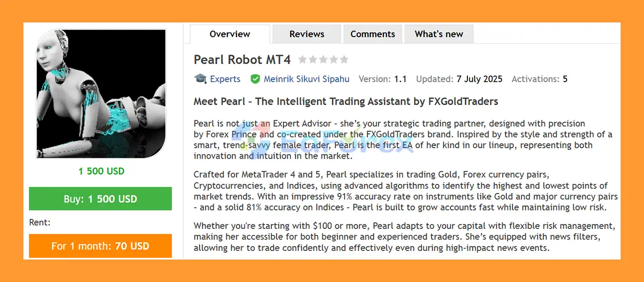 • Notable Products: Pearl Robot MT4, Gold robot experia and other advisors.