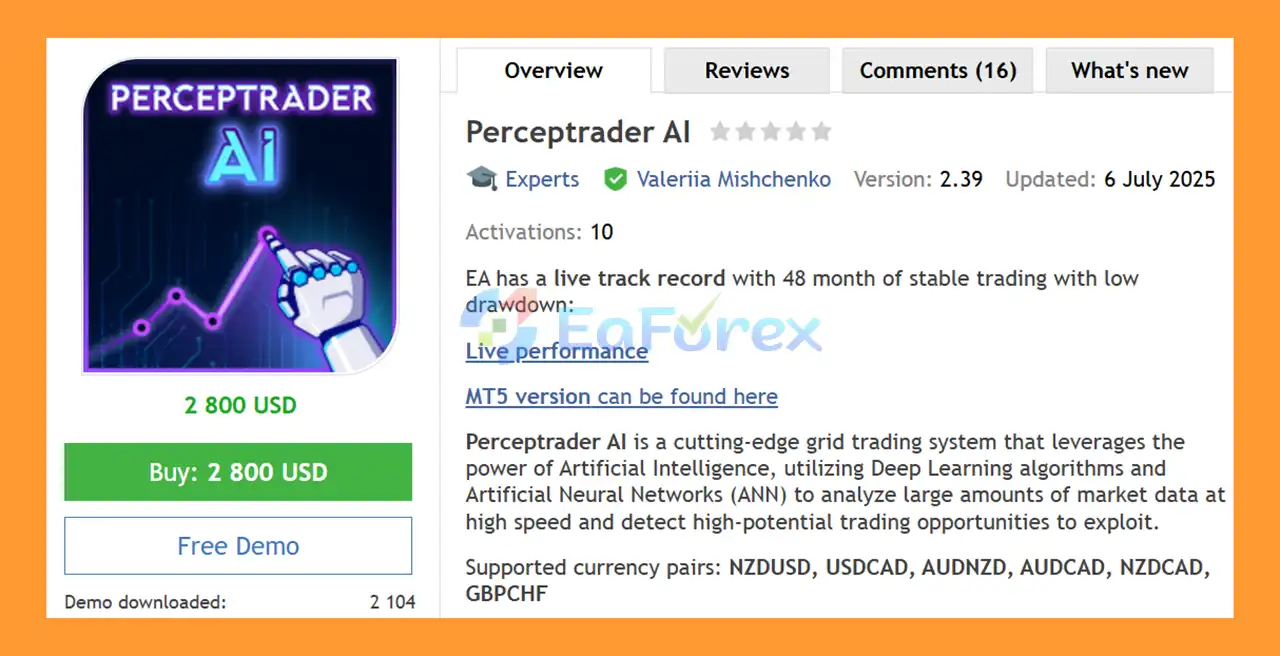 • Flagship Product: Perceptrader AI EA MT4 is rated as the best performing product of the year.