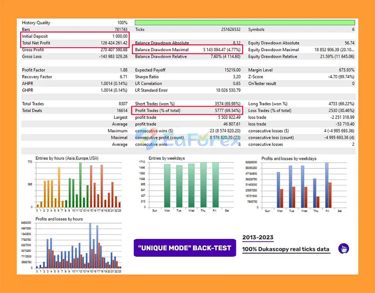 Live results show +302% profit over 6 years with a 65.7% win rate, proving consistent growth and capital preservation. Backtests (2013–2023) achieved profits over $126M–$229M from a $1,000 deposit, with drawdowns below 6%.