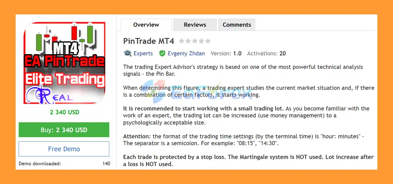 PinTrade MT4 is an automated trading EA that uses the powerful Pin Bar pattern to detect market reversals and trade safely on pairs like EURUSD, GBPUSD, USDJPY.