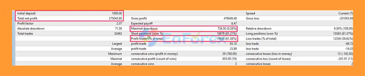 Backtests show an initial deposit of $1,000 yielding a total net profit of $275,045.80, a win rate of 61.38%, and a maximum drawdown of just 0.28%.