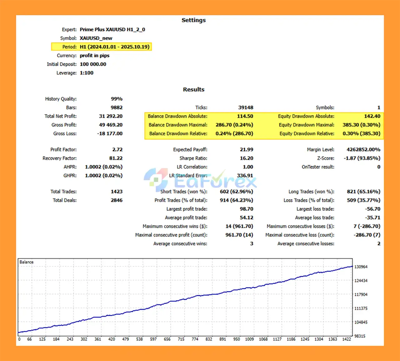 Prime Plus XAUUSD H1 MT5 is a professional automated Expert Advisor designed exclusively for Gold (XAUUSD) trading on the H1 timeframe, optimized for modern market conditions from 2024 to the present.