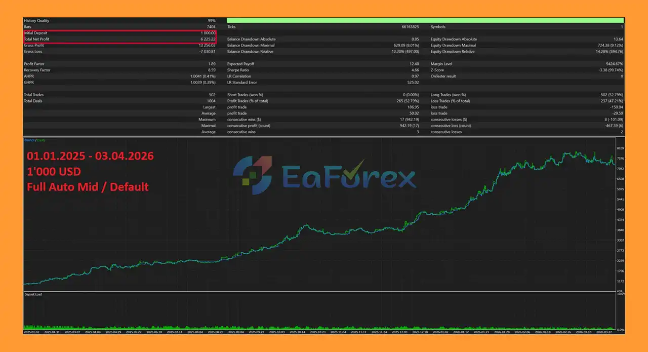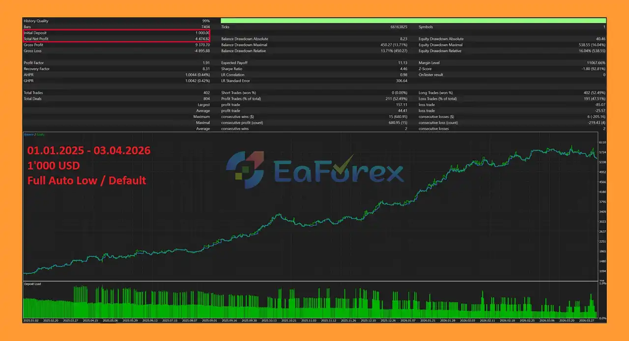 Backtest results show strong performance on XAUUSD, with consistent profitability and controlled drawdown. However, actual results may vary depending on market conditions and broker settings.