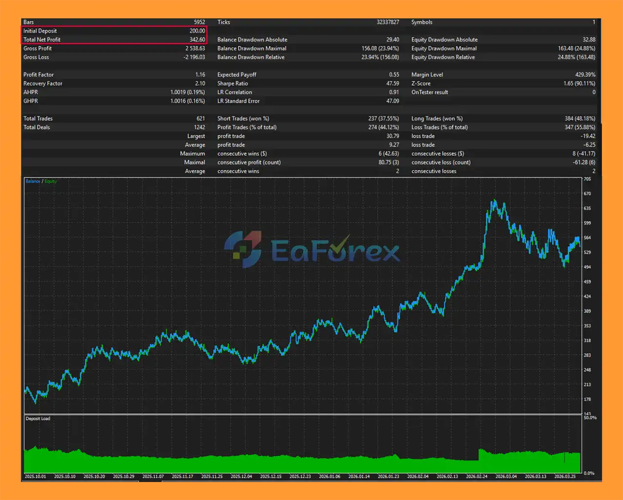 Backtests on XAUUSD show an initial deposit of $200 growing to $342.60 over multiple years, demonstrating consistent performance using breakout-based logic.