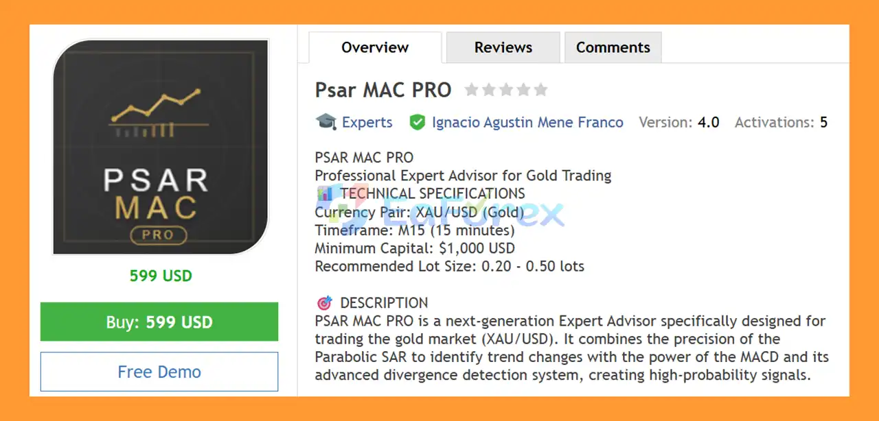 PSAR MAC PRO EA MT4 is a professional automated trading system designed exclusively for gold trading (XAU/USD) on the MetaTrader 4 platform. It combines Parabolic SAR trend detection with MACD momentum analysis and advanced divergence recognition to generate high-probability trade setups, optimized for the M15 timeframe.