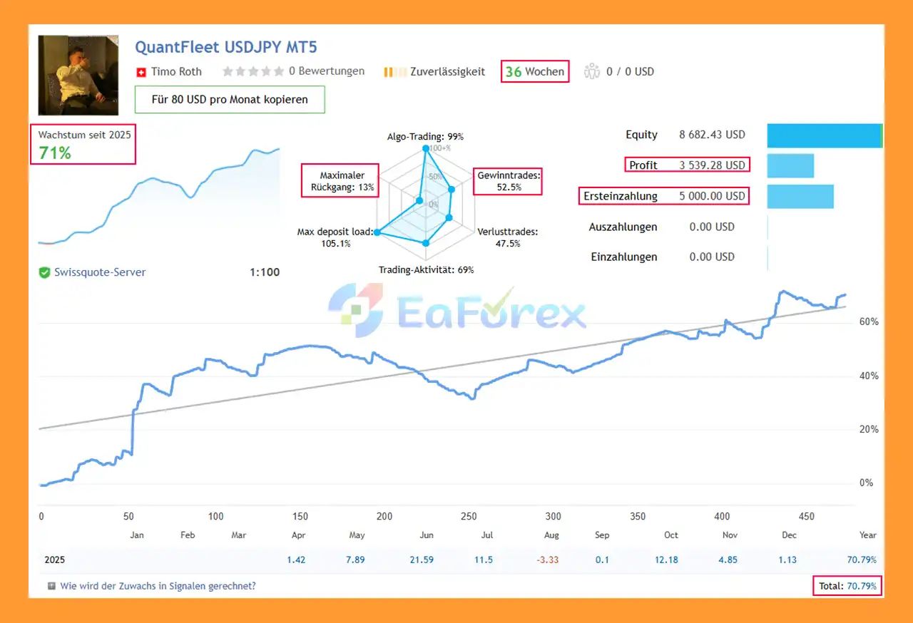 In summary, Quant Fleet MT5 is a professional-grade automated trading system engineered exclusively for USDJPY, built around a robust multi-strategy diversification framework. By combining five independent core strategies with supporting sub-strategies, it effectively reduces correlated risk while maintaining consistent long-term performance. Developed by Timo Roth, the EA emphasizes transparent logic, strict risk management, and realistic testing under real-market conditions. With strong live signal results, controlled drawdowns, and prop-firm–friendly design, Quant Fleet MT5 is an excellent choice for traders seeking stable, sustainable, and professionally managed automation on MetaTrader 5.