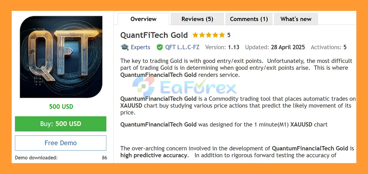 • Notable Products: QuantFiTech Gold EA MT5, QuantFiTech Pound and Euro MT5 and other advisors.
