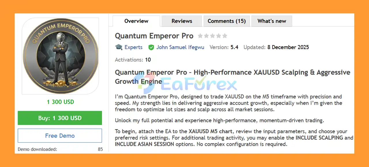 Quantum Emperor Pro MT5 is a high-performance automated trading Expert Advisor designed for aggressive XAUUSD (gold) scalping on MetaTrader 5. It is optimized for the M5 timeframe and focuses on exploiting gold’s momentum and intraday volatility.