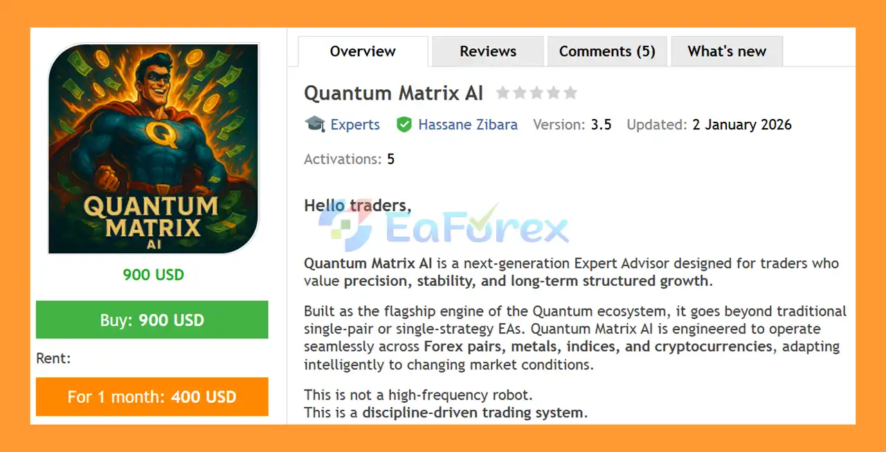 Quantum Matrix AI EA MT4 is a next-generation, discipline-driven Expert Advisor designed for traders seeking precision, long-term growth, and multi-market stability. Unlike typical single-strategy EAs, it adapts intelligently across Forex, metals, indices, and cryptocurrencies.