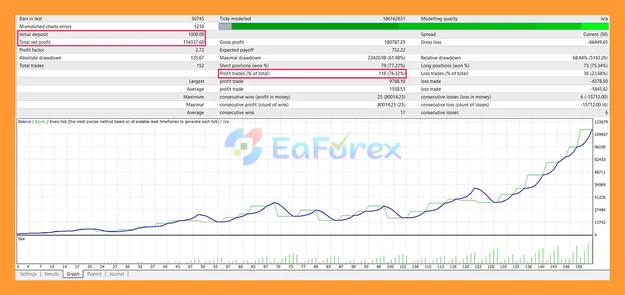 The EA works efficiently on M1 to H4 timeframes, adapting its strategy automatically based on market volatility and momentum.