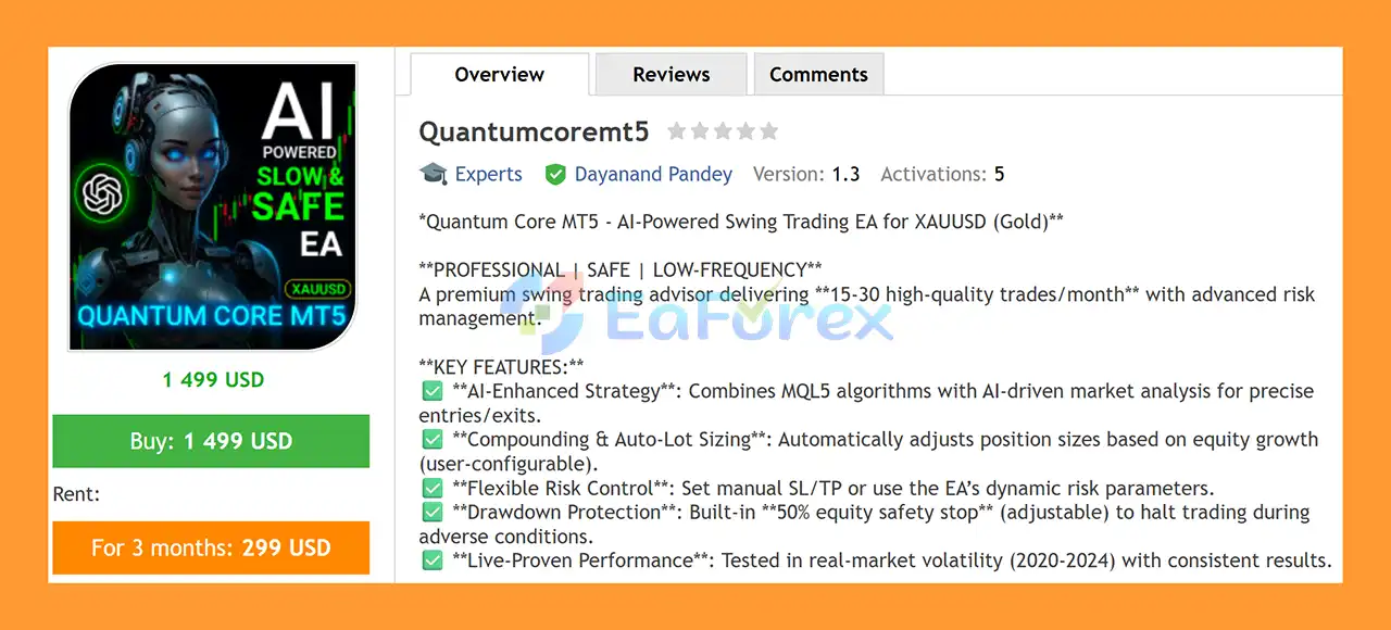 QuantumCore MT5 is an AI-powered swing trading Expert Advisor designed specifically for XAUUSD (Gold). It uses advanced algorithms, low-frequency trading logic, and strict risk controls to deliver high-quality, well-filtered trades each month.