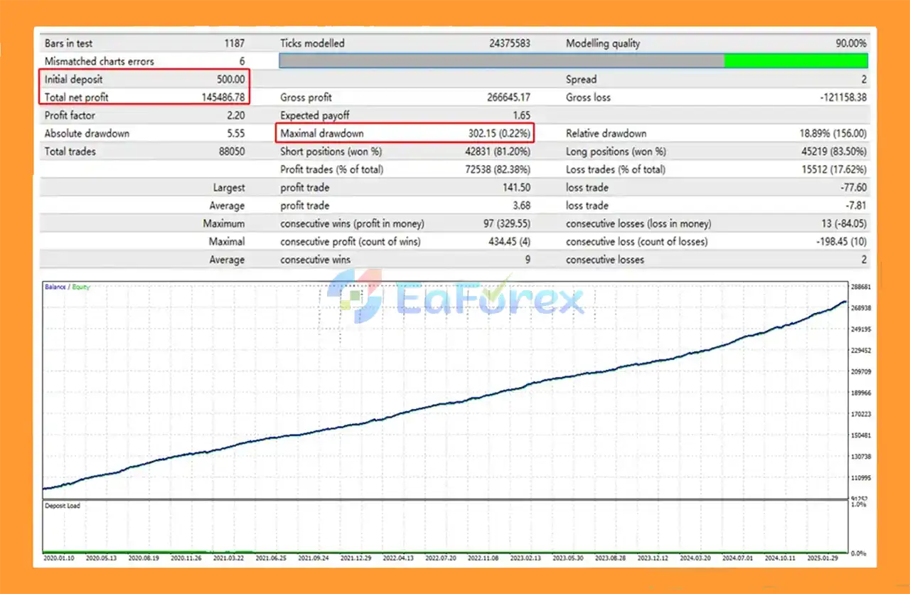 In backtests, R34P3R EA achieved impressive results with a win rate of 82.38%, a maximum drawdown of only 0.22%, and over $145,000 profit from a $500 deposit. These results highlight its balance between profitability and low risk exposure.