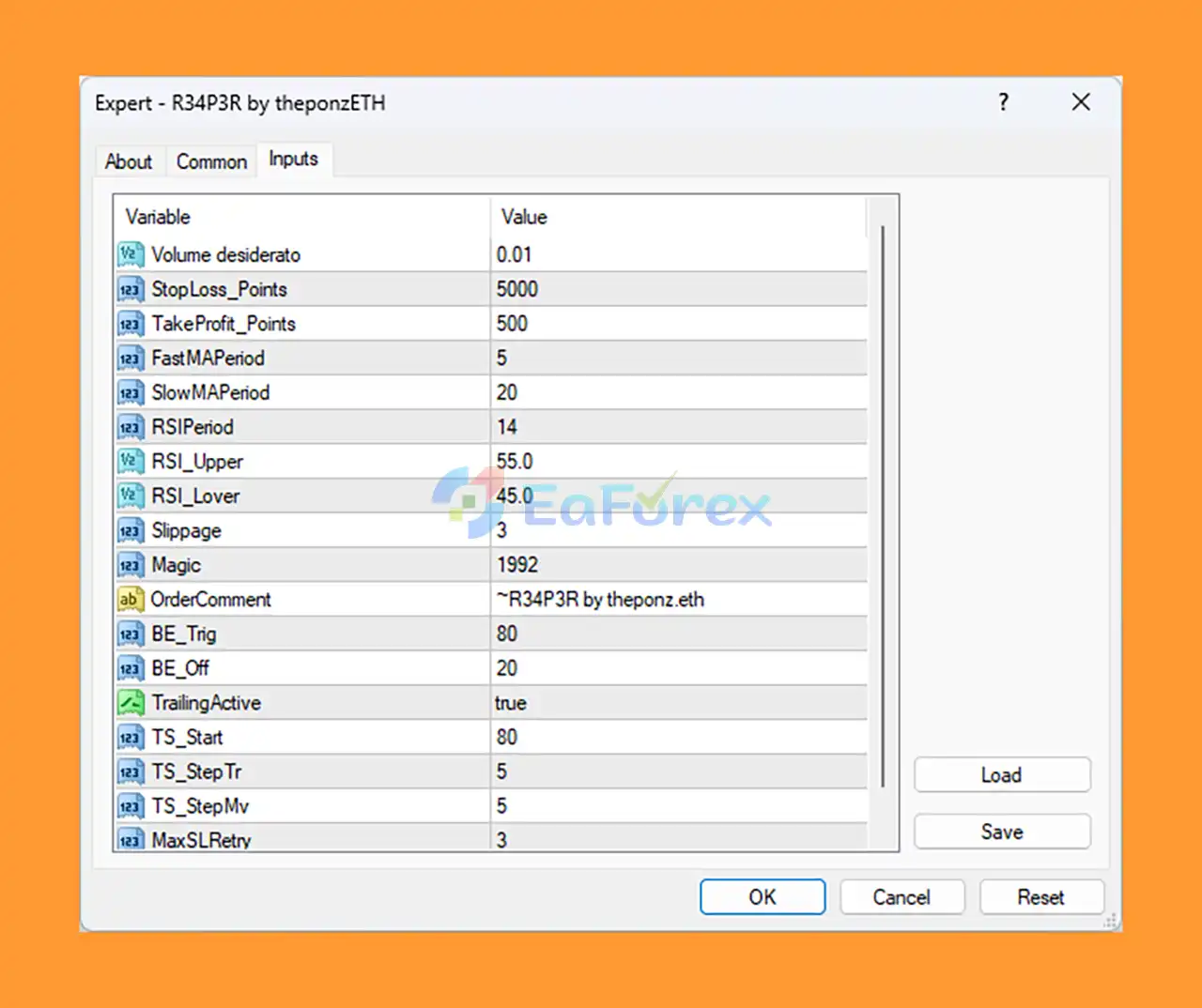 Yes. Traders can adjust lot size, Stop Loss, Take Profit, Moving Average periods, RSI levels, breakeven triggers, and trailing stop parameters. This flexibility allows R34P3R to fit different trading styles, risk levels, and broker conditions.