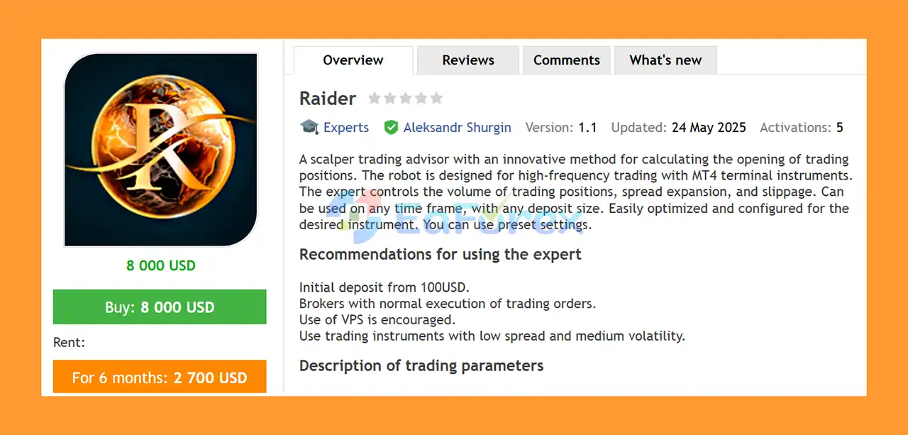 In summary, Raider EA MT4 is a powerful and flexible scalping robot designed for high-frequency trading. Its innovative entry algorithm, risk management tools, and adaptability make it suitable for traders seeking precise, automated trading on any instrument or timeframe. With customizable settings and preset options, Raider EA ensures reliable, efficient, and secure trading performance, whether for small accounts or professional setups.