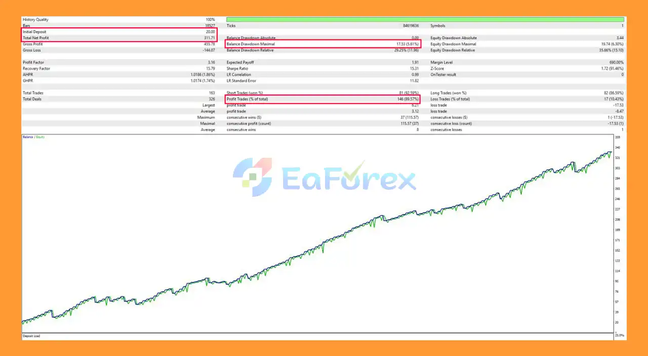 Historical backtests show a low drawdown profile, typically ranging between 6% and 11%, depending on broker conditions and execution quality.