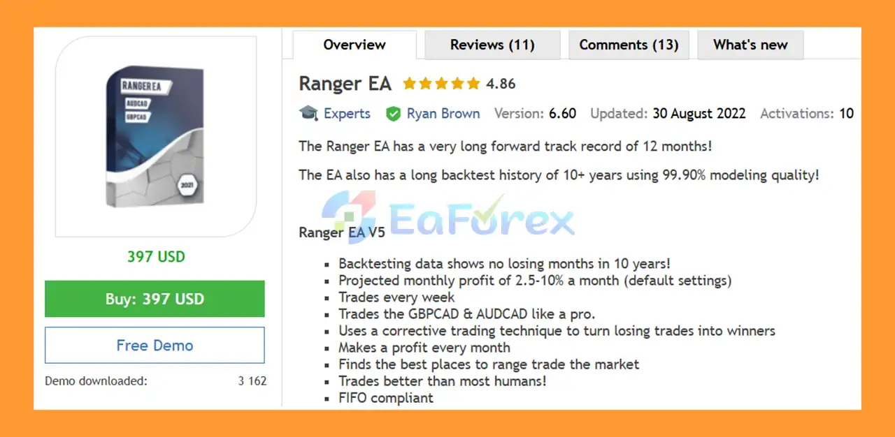 In summary, Ranger EA MT4 stands out as a powerful and reliable Forex Expert Advisor for traders seeking consistent, automated profits on the MetaTrader 4 platform. With over 10 years of high-quality backtesting, a strong 12-month forward performance, and intelligent range-trading strategies, it delivers stable monthly returns while effectively managing risk. Its focus on GBPCAD and AUDCAD, combined with advanced corrective trade management and optimized default settings, makes it an ideal choice for both beginners and experienced traders looking for a low-maintenance, professional trading solution.