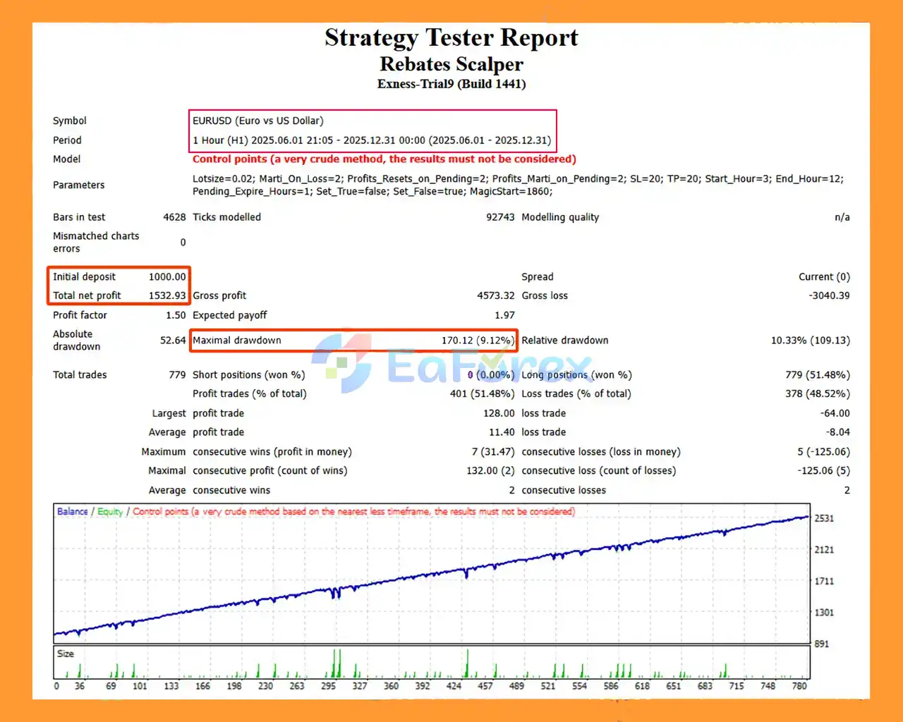 In a 6-month EURUSD backtest with a $1,000 initial deposit, Rebates Scalper EA MT4 achieved a net profit of $1,532.93 with a maximum drawdown of 9.12%. Past performance does not guarantee future results.