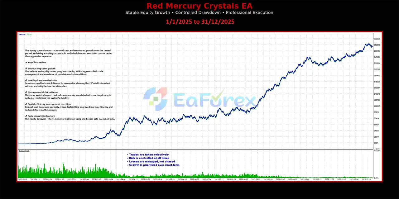 Red Mercury Crystals EA MT5 is an automated Gold (XAUUSD) trading EA focused on precise execution, adaptive risk management,and consistent long-term performance