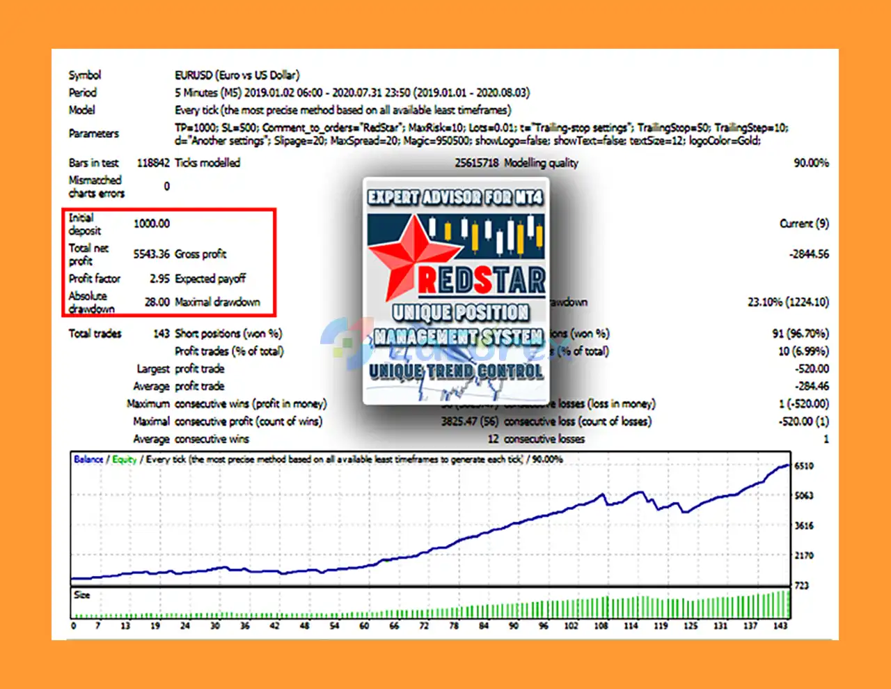 In summary, Red Star EA MT4 is a highly advanced and fully automated Forex trading robot designed for precision, efficiency, and risk-controlled trading. Utilizing amplitude-based trend analysis combined with market position tracking, the EA identifies high-probability entry points while minimizing drawdowns and protecting capital. Each trade is secured with mandatory Stop Loss and Take Profit, ensuring disciplined and safe trading. Optimized for M5 charts on major currency pairs, Red Star EA MT4 offers trailing stop functionality, customizable risk management, and precise trade execution controls, making it ideal for both short-term scalping and steady account growth. Backtests highlight significant net profits and controlled drawdowns, proving the EA’s reliability and consistency across different market conditions.