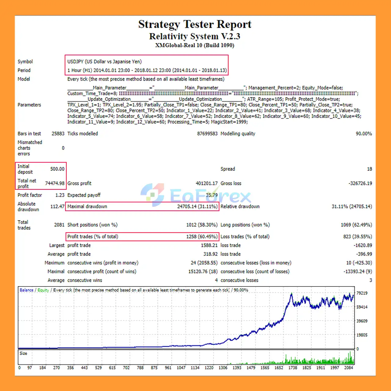 A 4-year backtest on USDJPY with an initial $500 deposit yielded a total net profit of $74,474.98, a win rate of 60.45%, and a maximum drawdown of 31.11%, demonstrating strong long-term profitability.