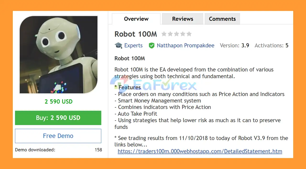Robot 100M EA MT4 Overview