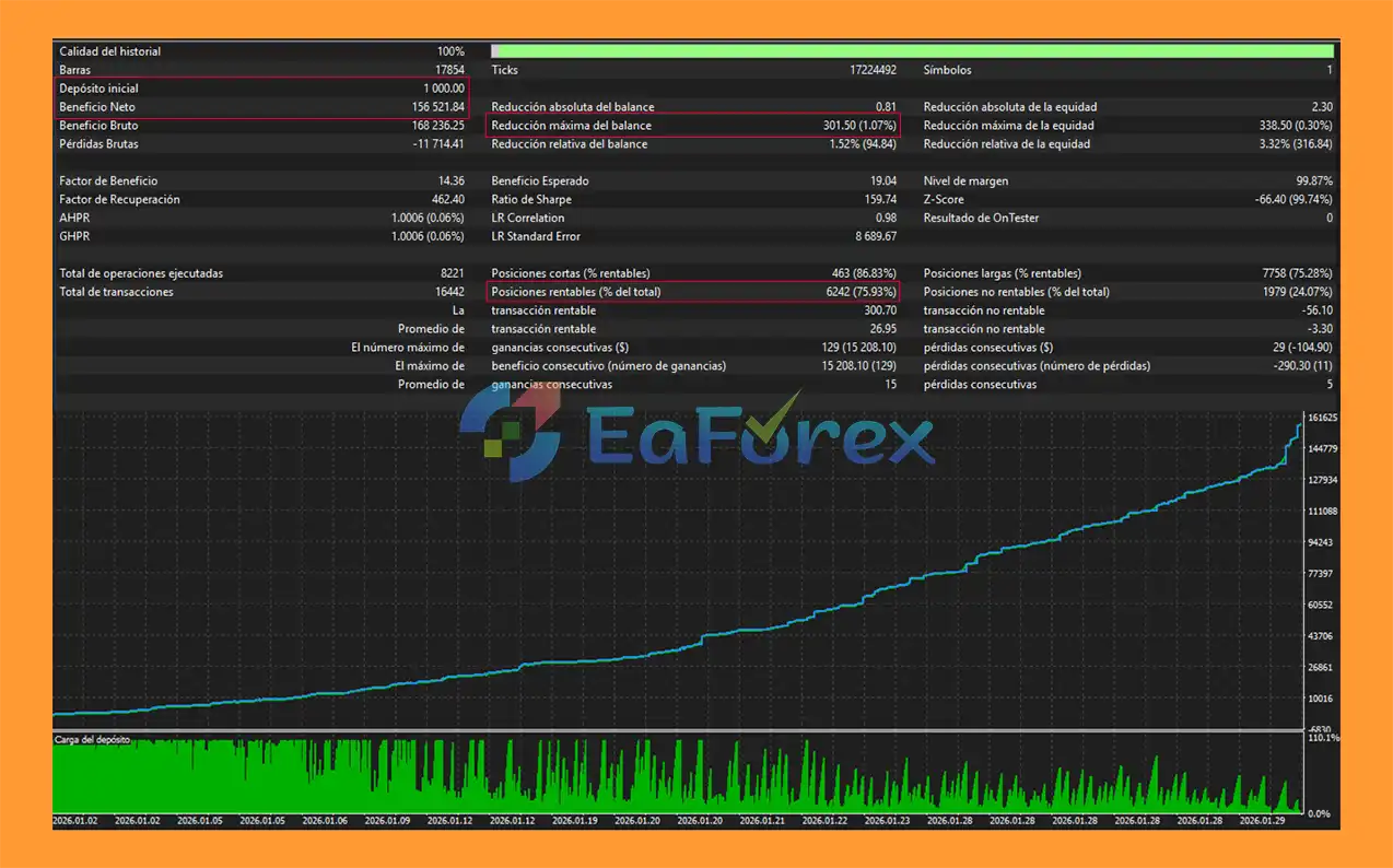 Backtests show strong performance with an initial deposit of $1,000 generating approximately $156,521 in net profit, a 79.93% win rate, and a low maximum drawdown of 1.07%.