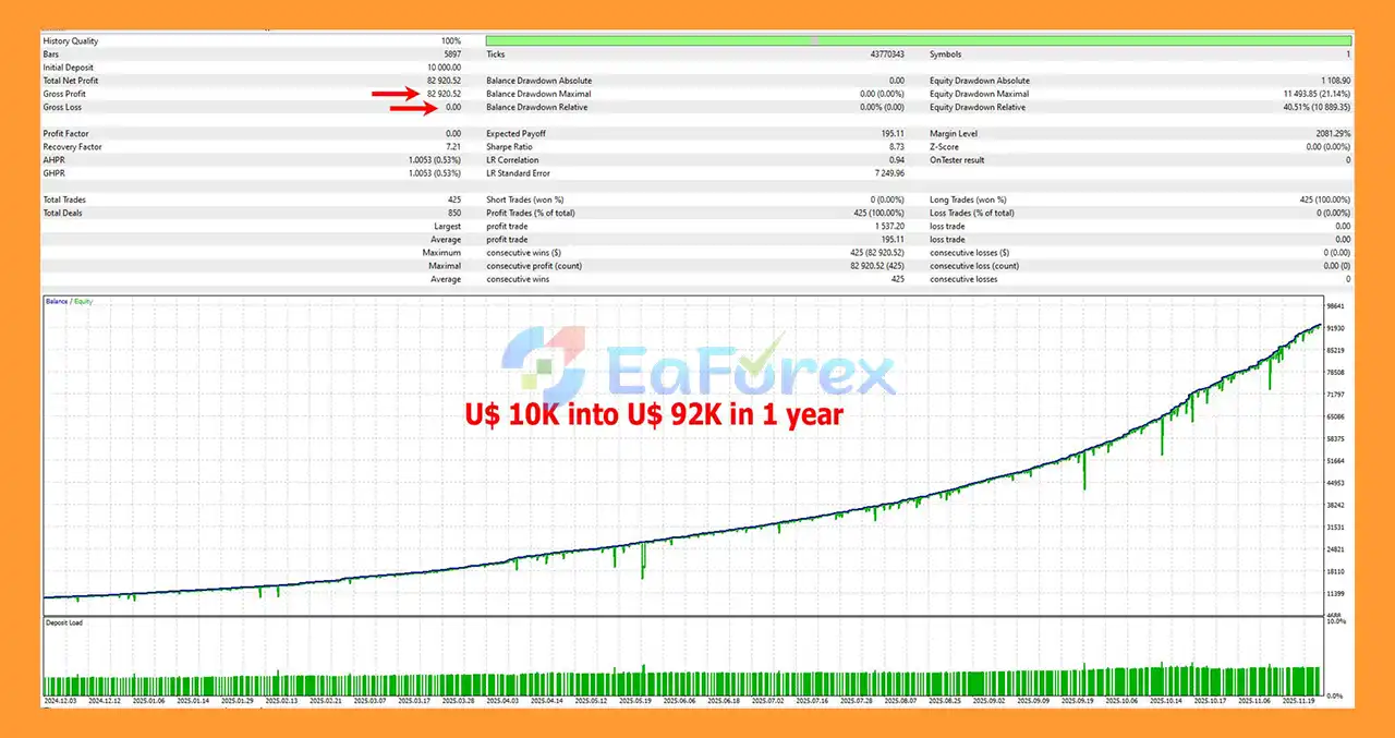 The EA can operate with as little as $100, depending on the chosen risk level and broker conditions. Higher deposits are recommended for more stable performance and lower relative drawdown.