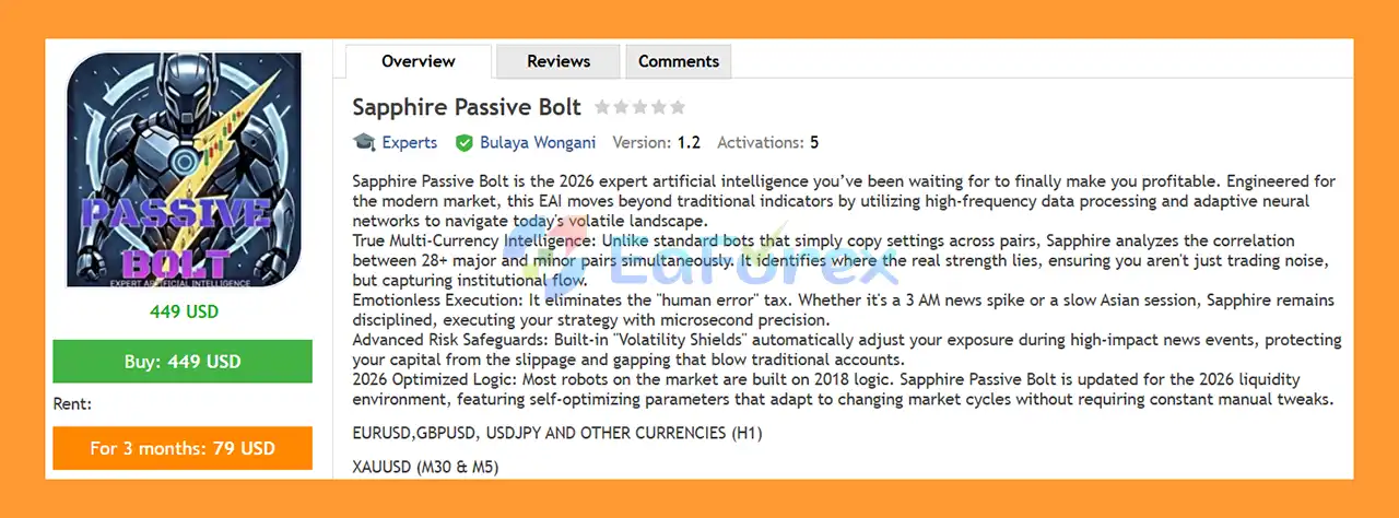 Sapphire Passive Bolt EA MT4 uses AI and neural networks to trade gold & currencies with precision, adaptive algorithms, and advanced risk management.