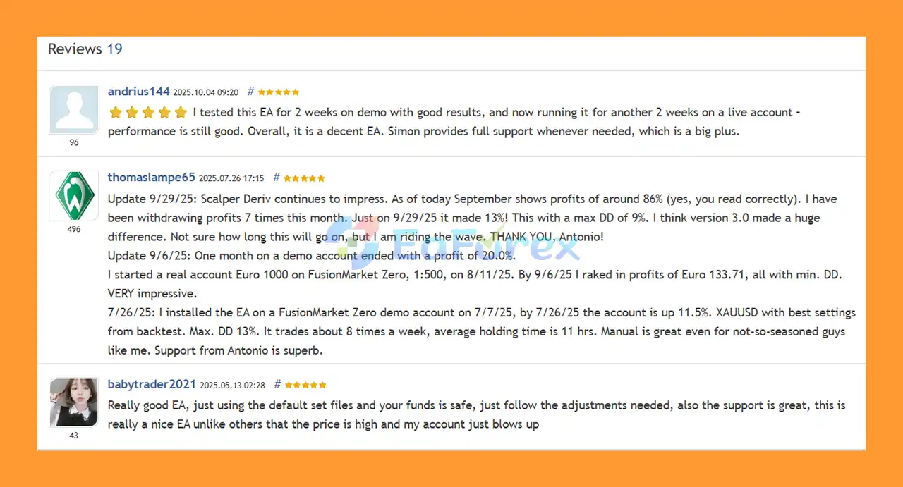 🔺Scalper Deriv EA MT5 is highly appreciated by the MQL5 community for bringing stable and reliable profits. Below are 5 star reviews from users:
